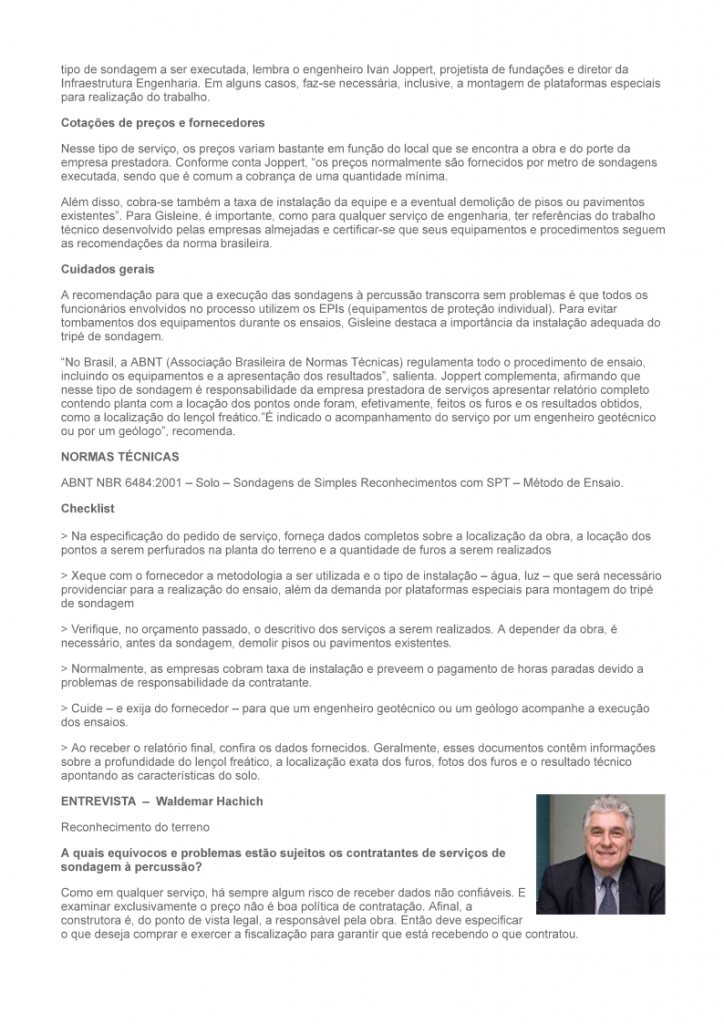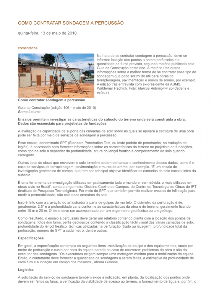 Na hora de se contratar sondagem à percussão, deve-se informar locação dos pontos a serem perfurados e a quantidade de furos prevista, segundo matéria publicada pelo Guia da Construção. A matéria traz outras informações sobre a melhor forma de se contratar esse tipo de sondagem que pode ser muito útil para obras de terraplenagem, pavimentação e muros de arrimo, por exemplo.
