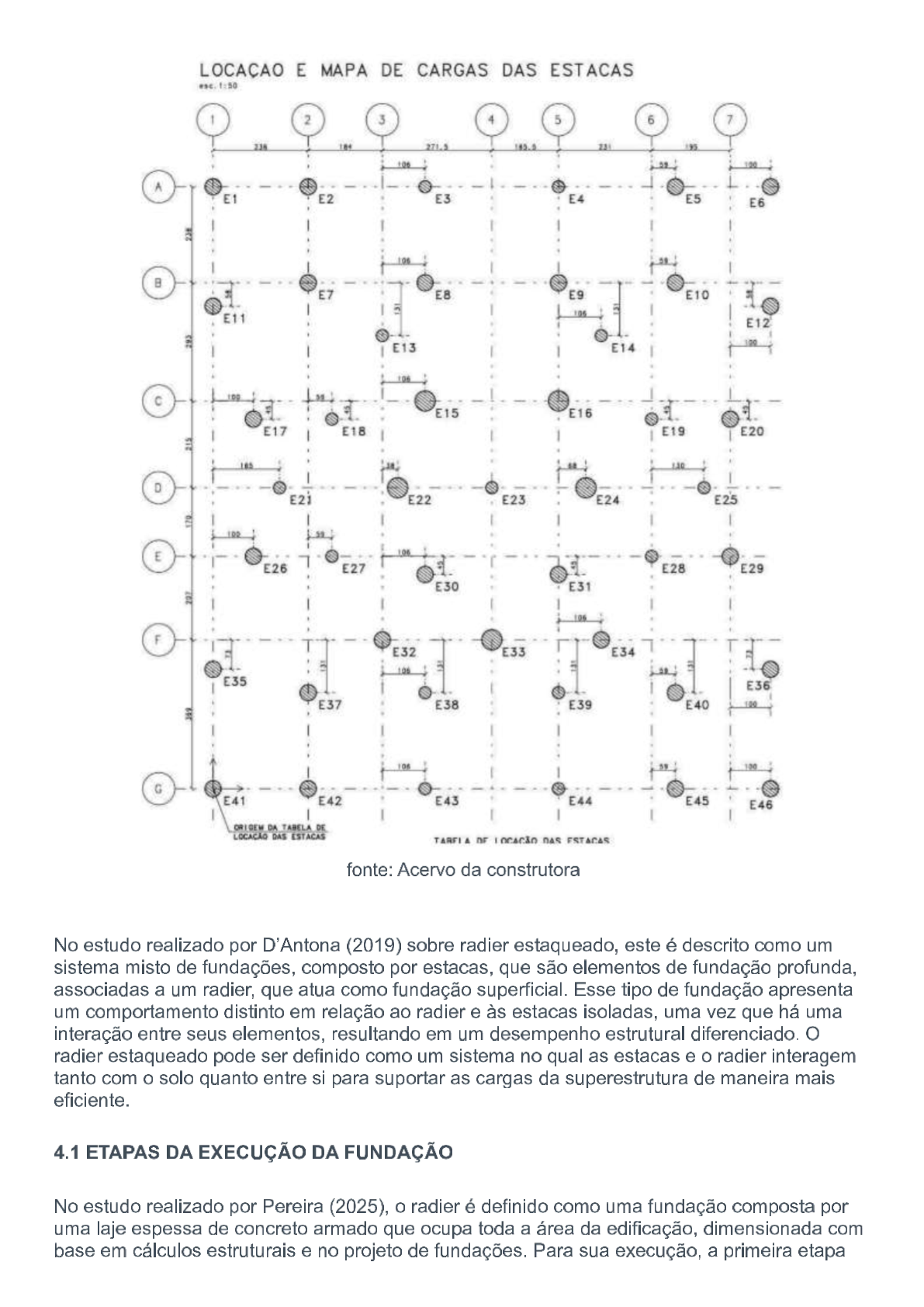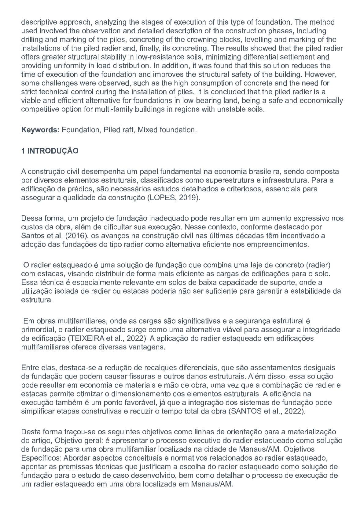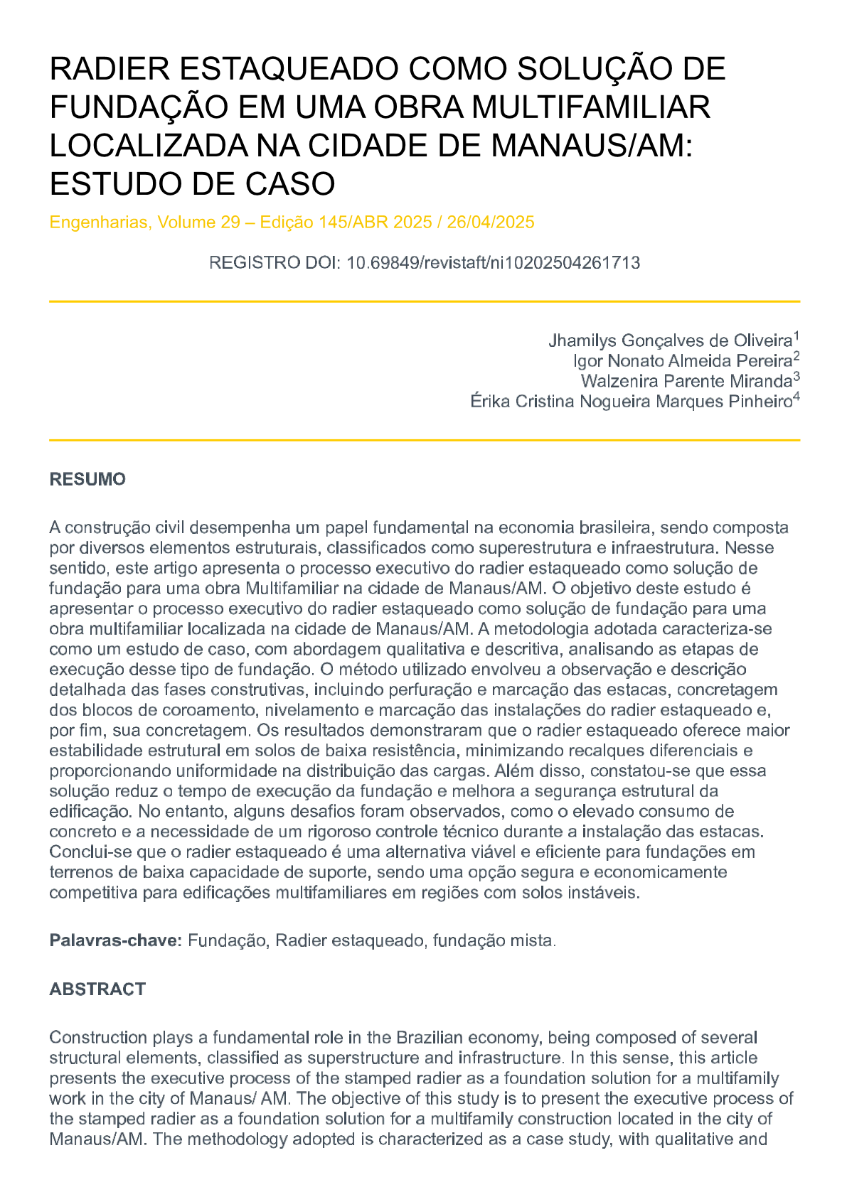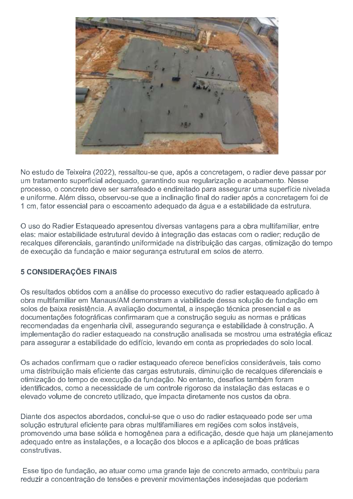 A construção civil desempenha um papel fundamental na economia brasileira, sendo composta por diversos elementos estruturais, classificados como superestrutura e infraestrutura. Nesse sentido, este artigo apresenta o processo executivo do radier estaqueado como solução de fundação para uma obra Multifamiliar na cidade de Manaus/AM. O objetivo deste estudo é apresentar o processo executivo do radier estaqueado como solução de fundação para uma obra multifamiliar localizada na cidade de Manaus/AM. A metodologia adotada caracteriza-se como um estudo de caso, com abordagem qualitativa e descritiva, analisando as etapas de execução desse tipo de fundação. O método utilizado envolveu a observação e descrição detalhada das fases construtivas, incluindo perfuração e marcação das estacas, concretagem dos blocos de coroamento, nivelamento e marcação das instalações do radier estaqueado e, por fim, sua concretagem. Os resultados demonstraram que o radier estaqueado oferece maior estabilidade estrutural em solos de baixa resistência, minimizando recalques diferenciais e proporcionando uniformidade na distribuição das cargas. Além disso, constatou-se que essa solução reduz o tempo de execução da fundação e melhora a segurança estrutural da edificação. No entanto, alguns desafios foram observados, como o elevado consumo de concreto e a necessidade de um rigoroso controle técnico durante a instalação das estacas. Conclui-se que o radier estaqueado é uma alternativa viável e eficiente para fundações em terrenos de baixa capacidade de suporte, sendo uma opção segura e economicamente competitiva para edificações multifamiliares em regiões com solos instáveis.