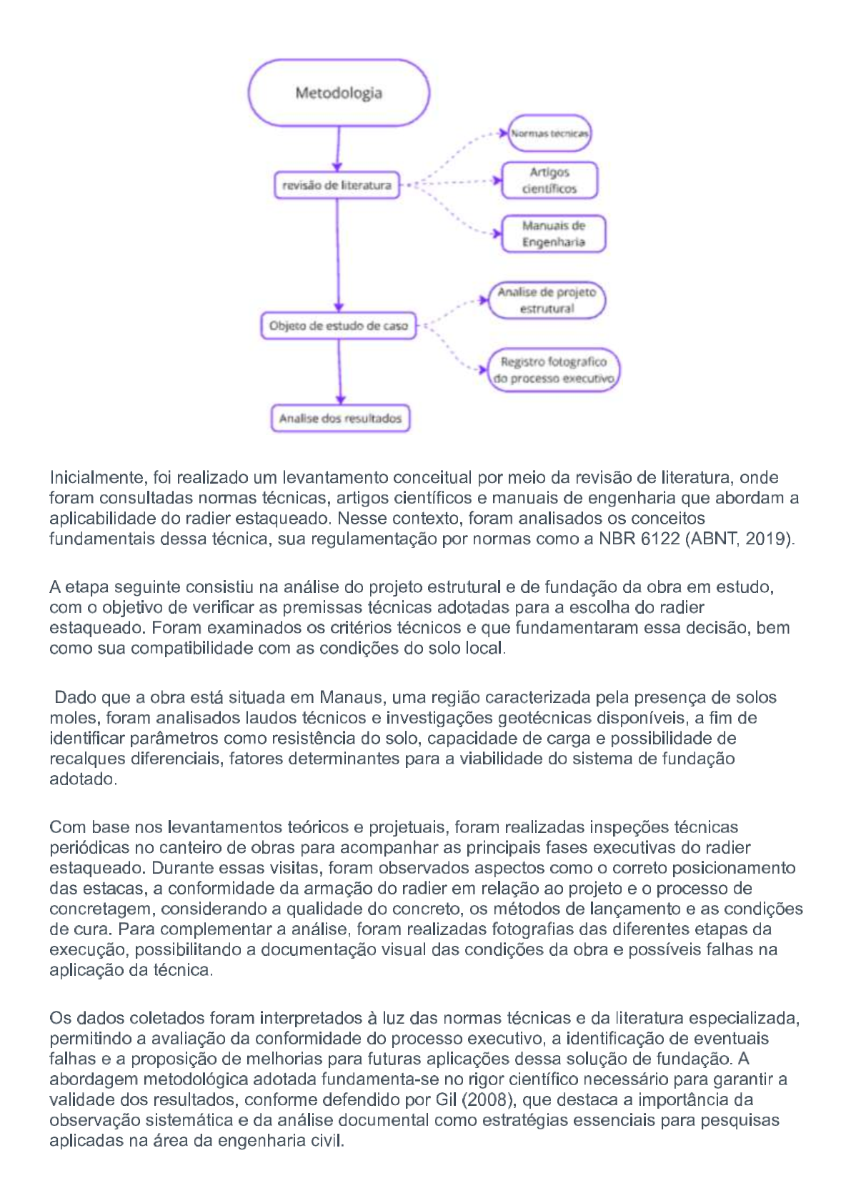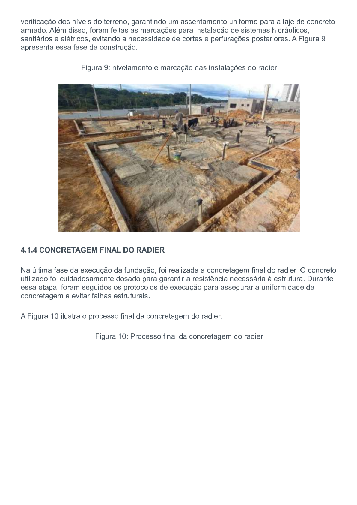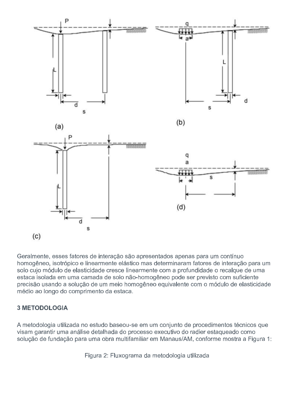 A construção civil desempenha um papel fundamental na economia brasileira, sendo composta por diversos elementos estruturais, classificados como superestrutura e infraestrutura. Nesse sentido, este artigo apresenta o processo executivo do radier estaqueado como solução de fundação para uma obra Multifamiliar na cidade de Manaus/AM. O objetivo deste estudo é apresentar o processo executivo do radier estaqueado como solução de fundação para uma obra multifamiliar localizada na cidade de Manaus/AM. A metodologia adotada caracteriza-se como um estudo de caso, com abordagem qualitativa e descritiva, analisando as etapas de execução desse tipo de fundação. O método utilizado envolveu a observação e descrição detalhada das fases construtivas, incluindo perfuração e marcação das estacas, concretagem dos blocos de coroamento, nivelamento e marcação das instalações do radier estaqueado e, por fim, sua concretagem. Os resultados demonstraram que o radier estaqueado oferece maior estabilidade estrutural em solos de baixa resistência, minimizando recalques diferenciais e proporcionando uniformidade na distribuição das cargas. Além disso, constatou-se que essa solução reduz o tempo de execução da fundação e melhora a segurança estrutural da edificação. No entanto, alguns desafios foram observados, como o elevado consumo de concreto e a necessidade de um rigoroso controle técnico durante a instalação das estacas. Conclui-se que o radier estaqueado é uma alternativa viável e eficiente para fundações em terrenos de baixa capacidade de suporte, sendo uma opção segura e economicamente competitiva para edificações multifamiliares em regiões com solos instáveis.