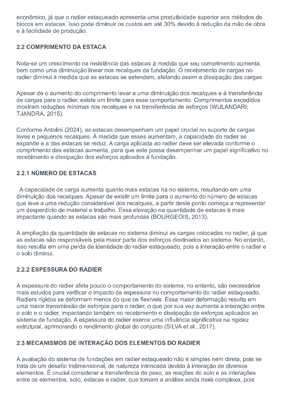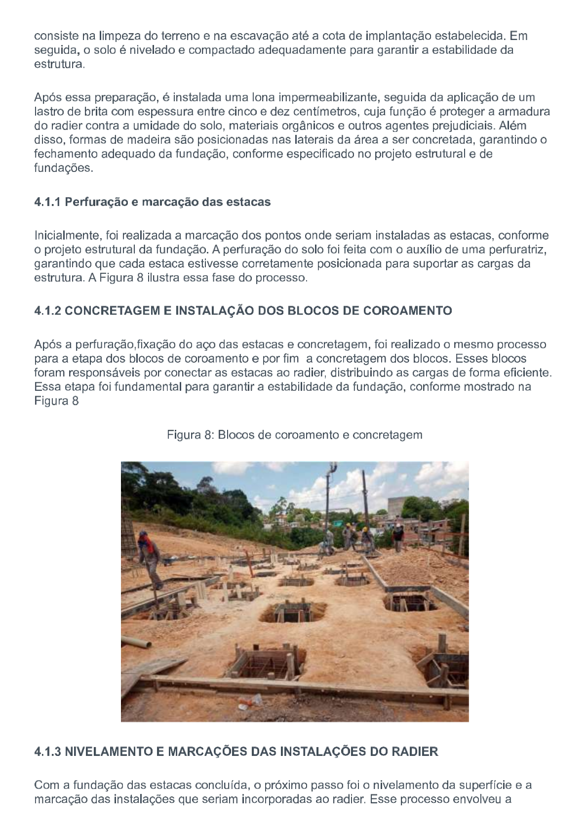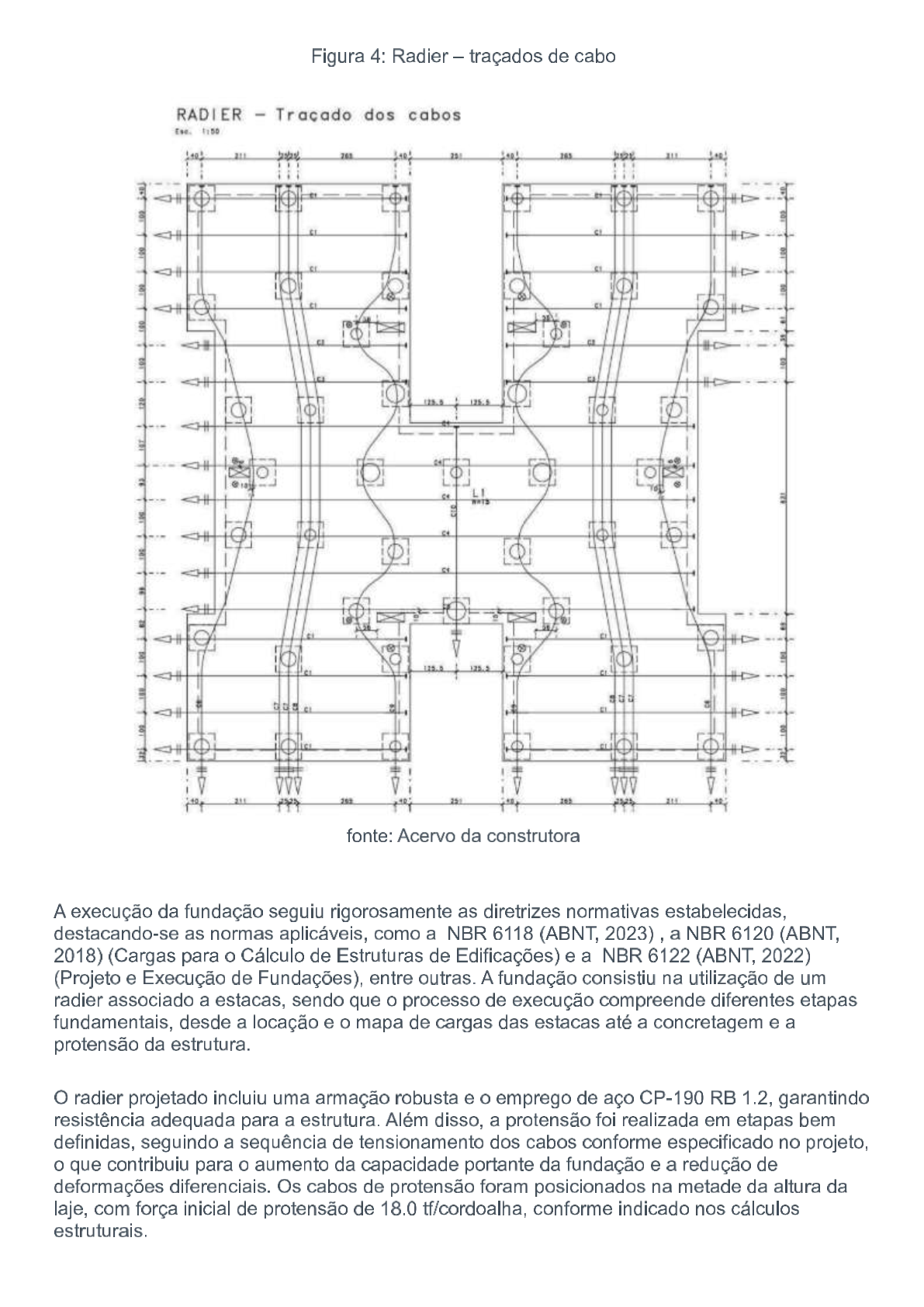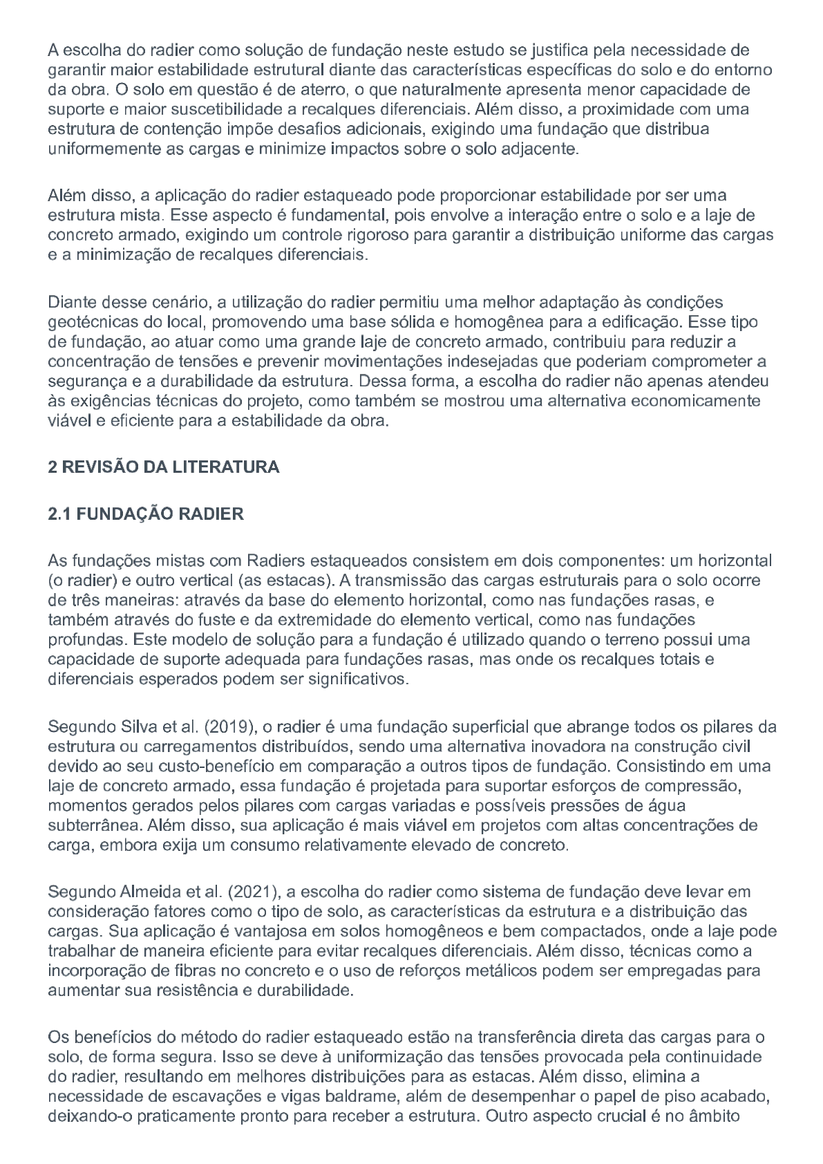 A construção civil desempenha um papel fundamental na economia brasileira, sendo composta por diversos elementos estruturais, classificados como superestrutura e infraestrutura. Nesse sentido, este artigo apresenta o processo executivo do radier estaqueado como solução de fundação para uma obra Multifamiliar na cidade de Manaus/AM. O objetivo deste estudo é apresentar o processo executivo do radier estaqueado como solução de fundação para uma obra multifamiliar localizada na cidade de Manaus/AM. A metodologia adotada caracteriza-se como um estudo de caso, com abordagem qualitativa e descritiva, analisando as etapas de execução desse tipo de fundação. O método utilizado envolveu a observação e descrição detalhada das fases construtivas, incluindo perfuração e marcação das estacas, concretagem dos blocos de coroamento, nivelamento e marcação das instalações do radier estaqueado e, por fim, sua concretagem. Os resultados demonstraram que o radier estaqueado oferece maior estabilidade estrutural em solos de baixa resistência, minimizando recalques diferenciais e proporcionando uniformidade na distribuição das cargas. Além disso, constatou-se que essa solução reduz o tempo de execução da fundação e melhora a segurança estrutural da edificação. No entanto, alguns desafios foram observados, como o elevado consumo de concreto e a necessidade de um rigoroso controle técnico durante a instalação das estacas. Conclui-se que o radier estaqueado é uma alternativa viável e eficiente para fundações em terrenos de baixa capacidade de suporte, sendo uma opção segura e economicamente competitiva para edificações multifamiliares em regiões com solos instáveis.