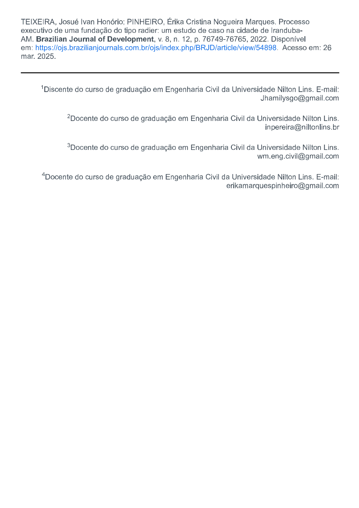 (4) Docente do curso de graduação em Engenharia Civil da Universidade Nilton Lins. E-mail: erikamarquespinheiro@gmail.com