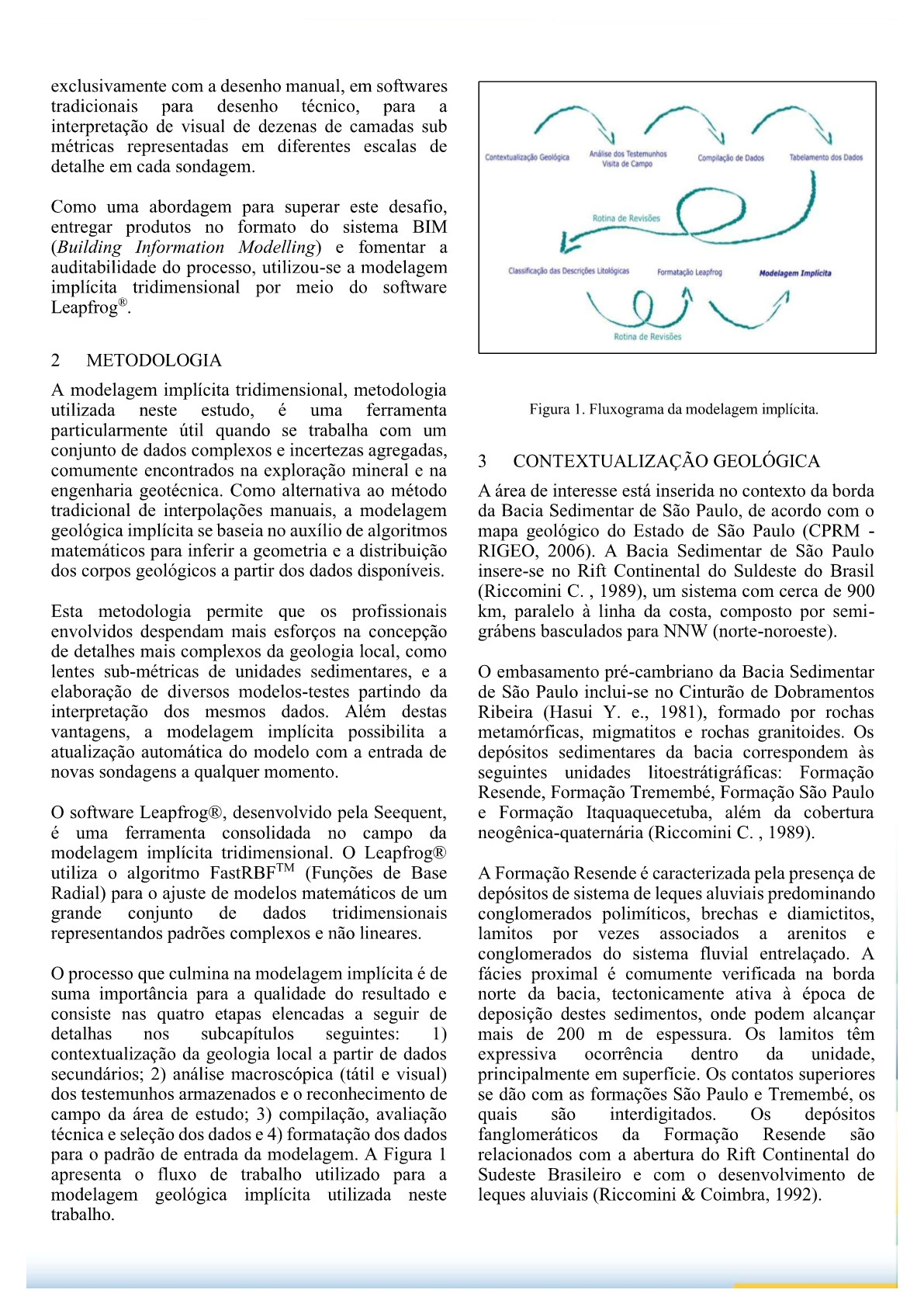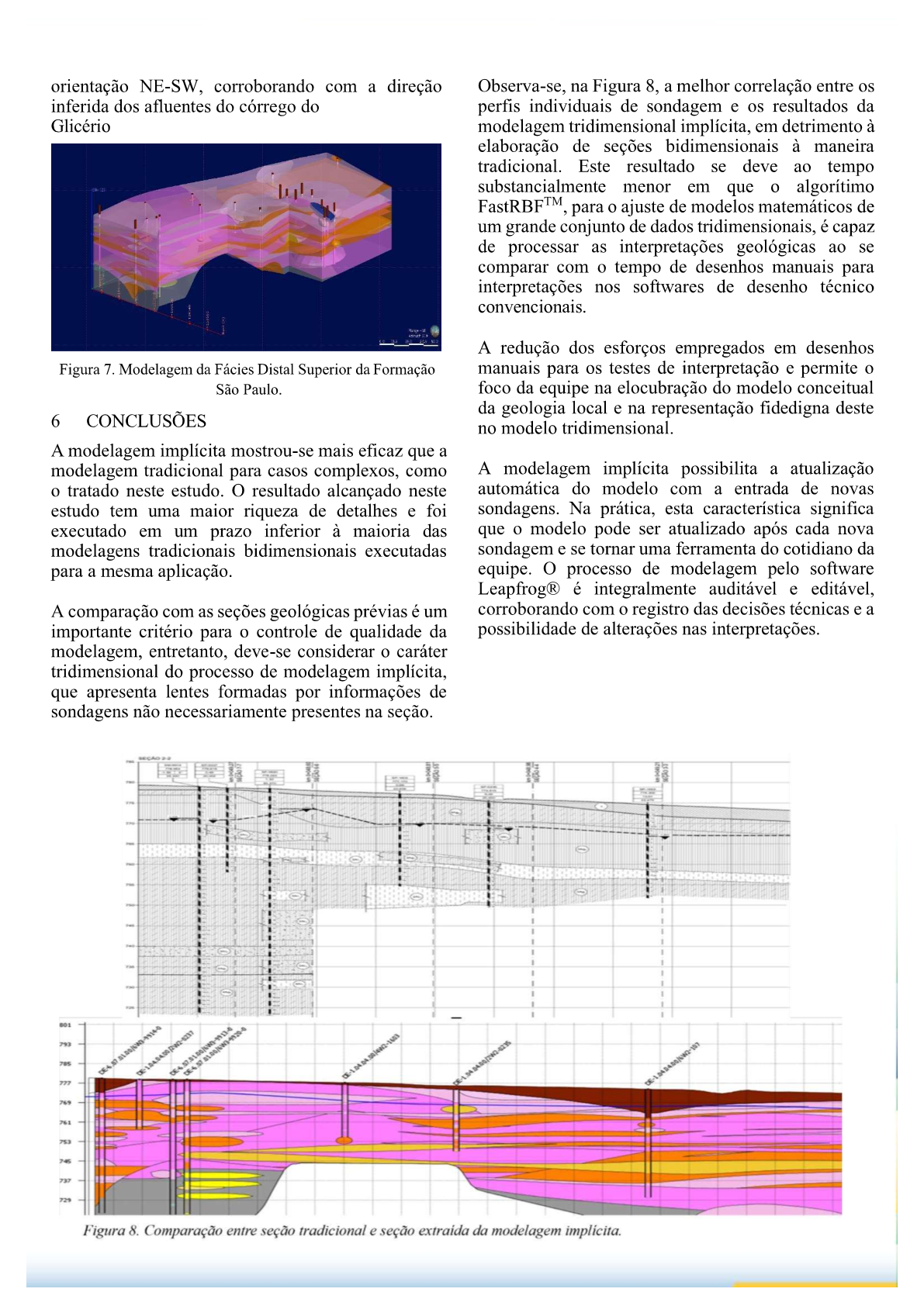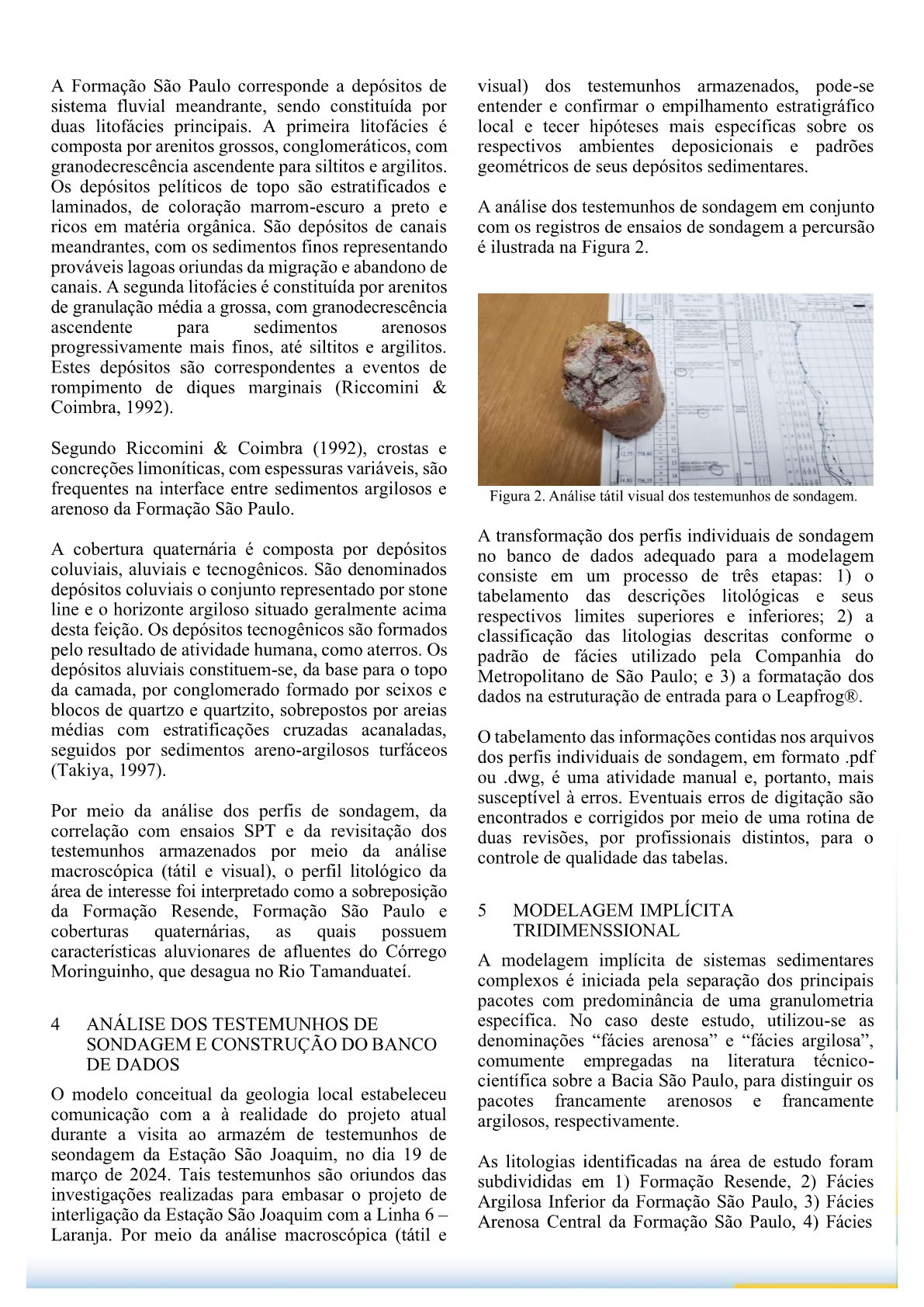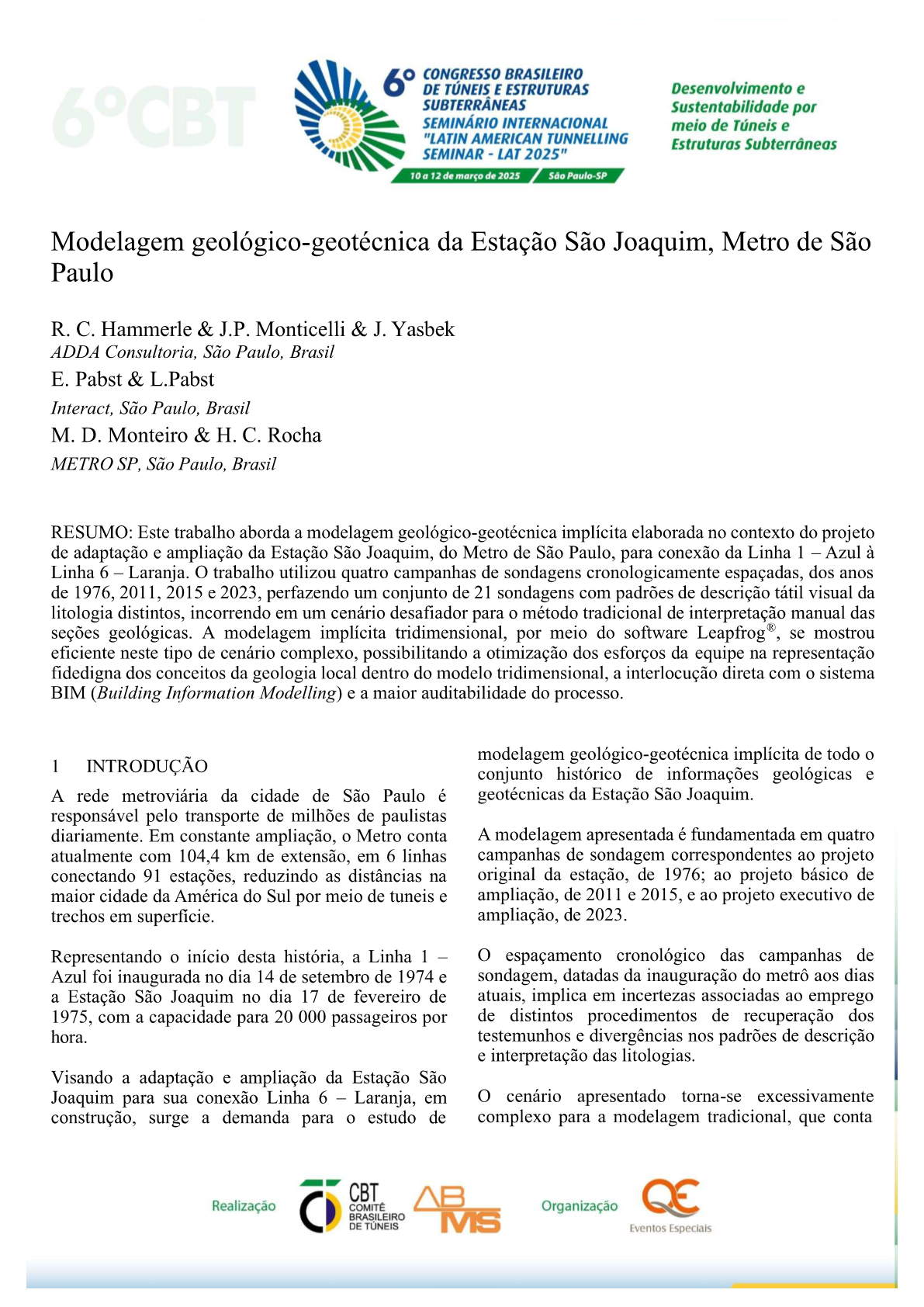 Este trabalho aborda a modelagem geológico-geotécnica implícita elaborada no contexto do projeto de adaptação e ampliação da Estação São Joaquim, do Metro de São Paulo, para conexão da Linha 1 – Azul à Linha 6 – Laranja. O trabalho utilizou quatro campanhas de sondagens cronologicamente espaçadas, dos anos de 1976, 2011, 2015 e 2023, perfazendo um conjunto de 21 sondagens com padrões de descrição tátil visual da litologia distintos, incorrendo em um cenário desafiador para o método tradicional de interpretação manual das seções geológicas. A modelagem implícita tridimensional, por meio do software Leapfrog® , se mostrou eficiente neste tipo de cenário complexo, possibilitando a otimização dos esforços da equipe na representação fidedigna dos conceitos da geologia local dentro do modelo tridimensional, a interlocução direta com o sistema BIM (Building Information Modelling) e a maior auditabilidade do processo.