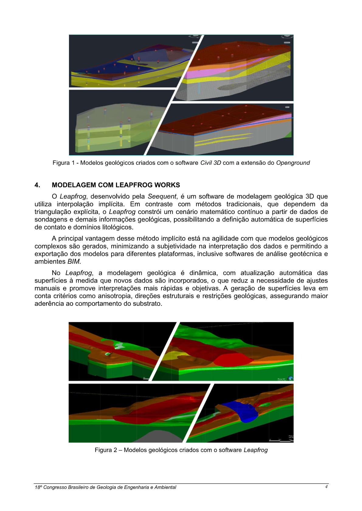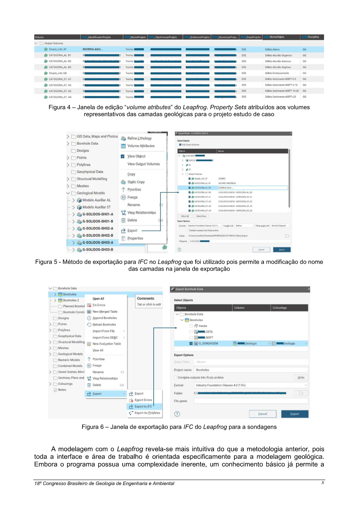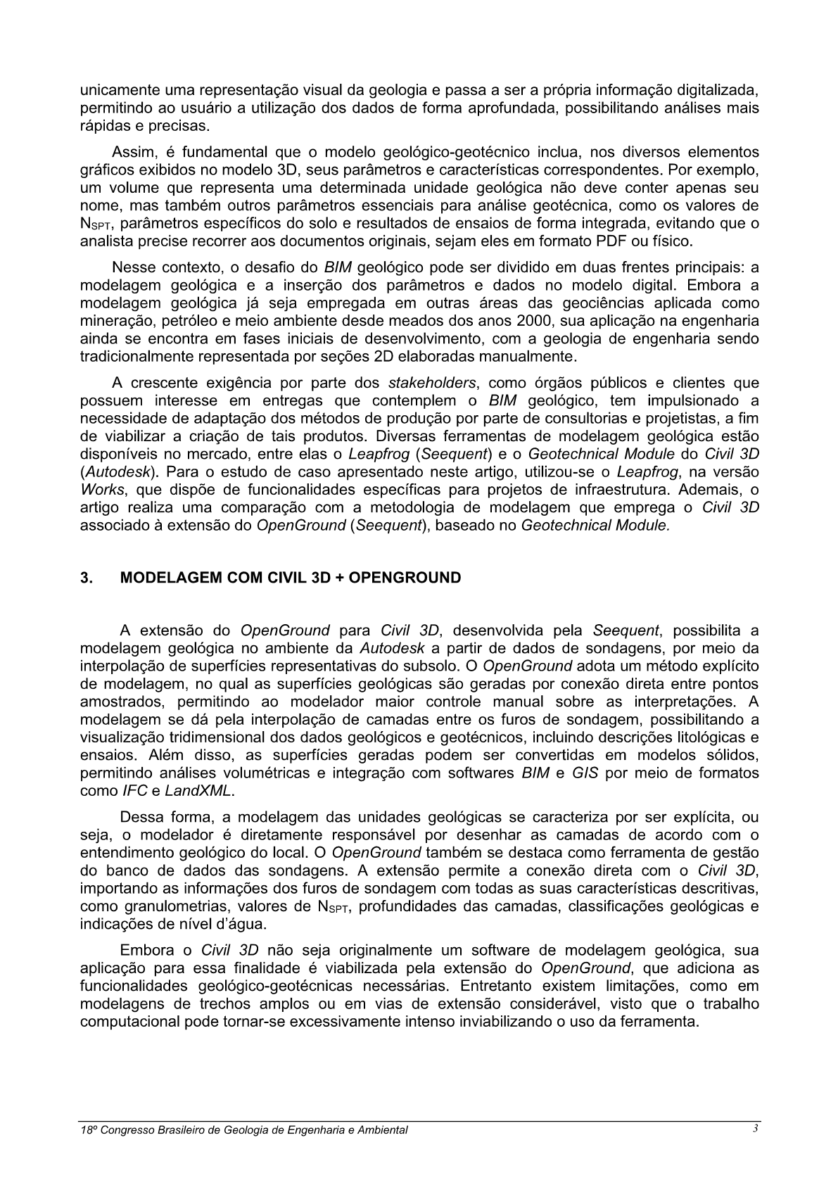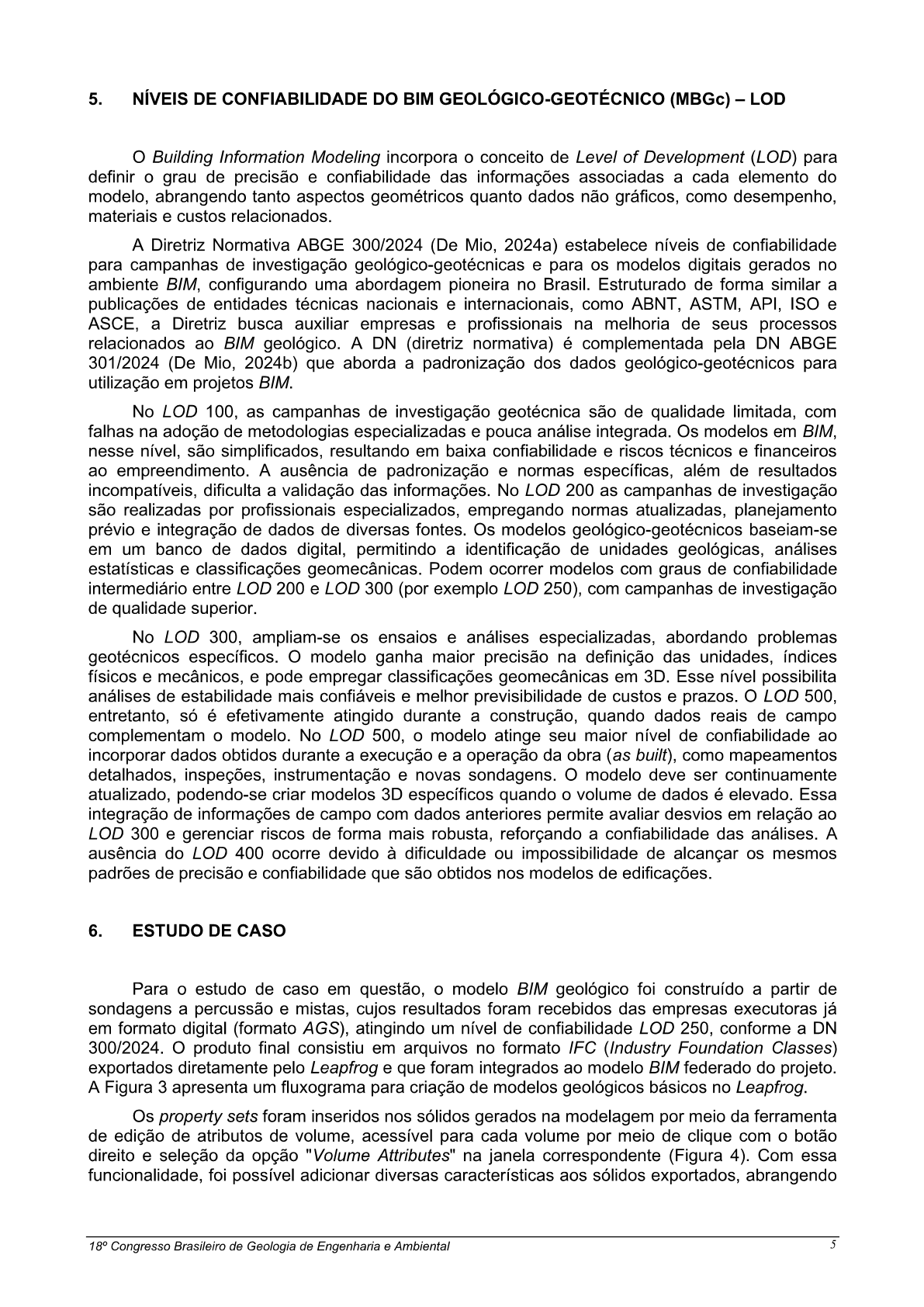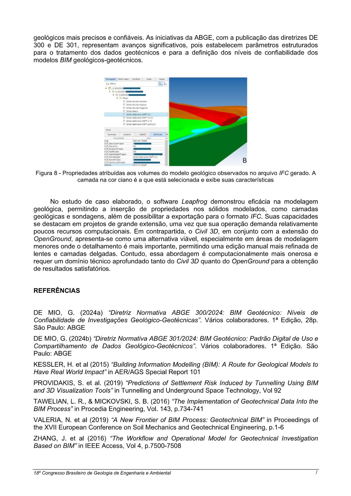 A implementação do Building Information Modeling (BIM) no contexto geológico tem crescido no Brasil, apesar de ainda estar em estágio inicial quando comparado ao cenário europeu e norte-americano. Este artigo apresenta um estudo de caso em que modelos geológicos BIM foram elaborados com base em dados digitais de sondagens (formato AGS), atingindo nível de confiabilidade LOD 250 segundo a DN 300/2024. A metodologia envolveu a exportação dos modelos gerados no software Leapfrog para o formato IFC (Industry Foundation Classes), permitindo integração ao modelo federado do projeto. Foram inseridos property sets nos modelos sólidos gerados, incorporando atributos geológico-geotécnicos e outras informações relevantes ao projeto. O uso do Leapfrog mostrou-se particularmente eficaz em projetos de grande extensão, graças à sua facilidade de uso, menor demanda computacional e à capacidade de gerar automaticamente superfícies geológicas. Por outro lado, o Civil 3D integrado ao OpenGround permite maior controle manual, sendo mais adequado para áreas menores e geologias mais complexas, apesar de exigir maiores investimentos em treinamento e recursos técnicos. Dessa forma, torna-se evidente a necessidade de padronizar práticas e desenvolver metodologias robustas para o setor geotécnico brasileiro, ressaltando-se iniciativas importantes como as diretrizes da ABGE (DE 300 e DE 301).