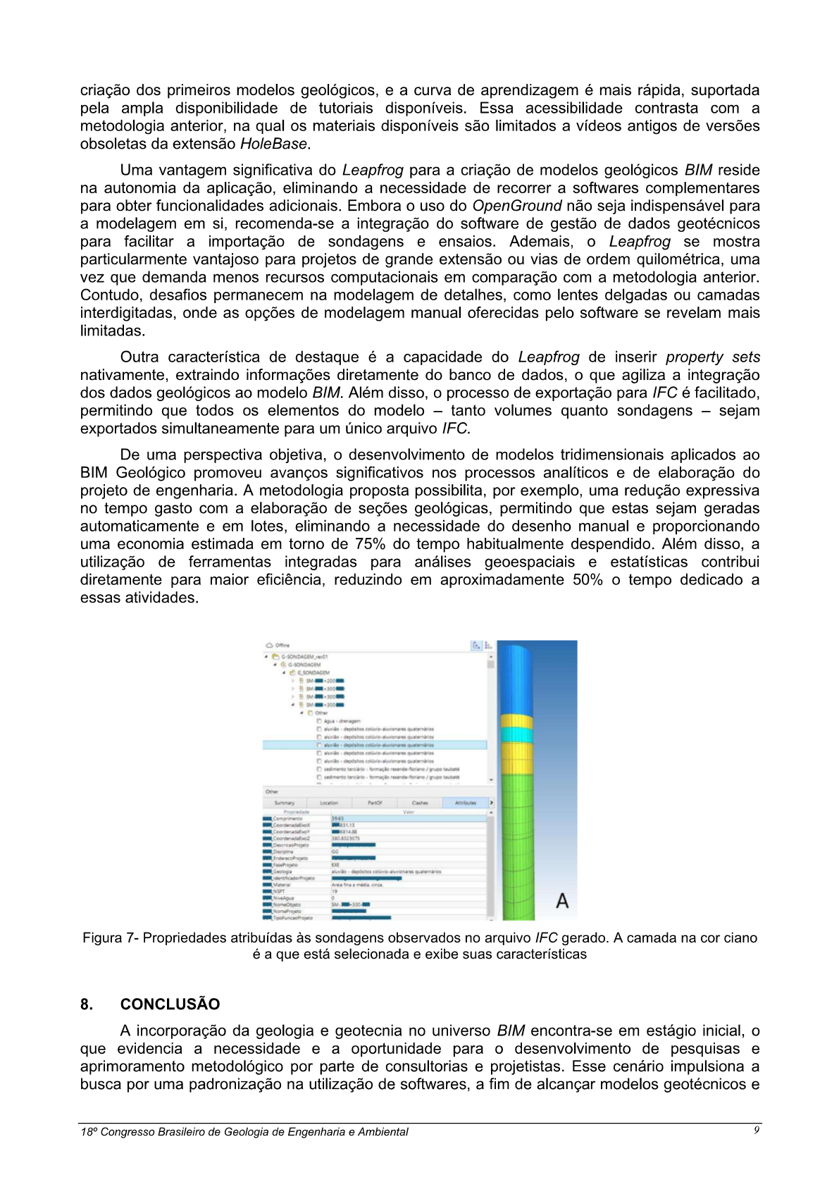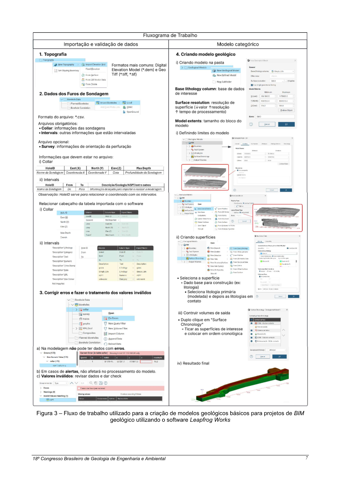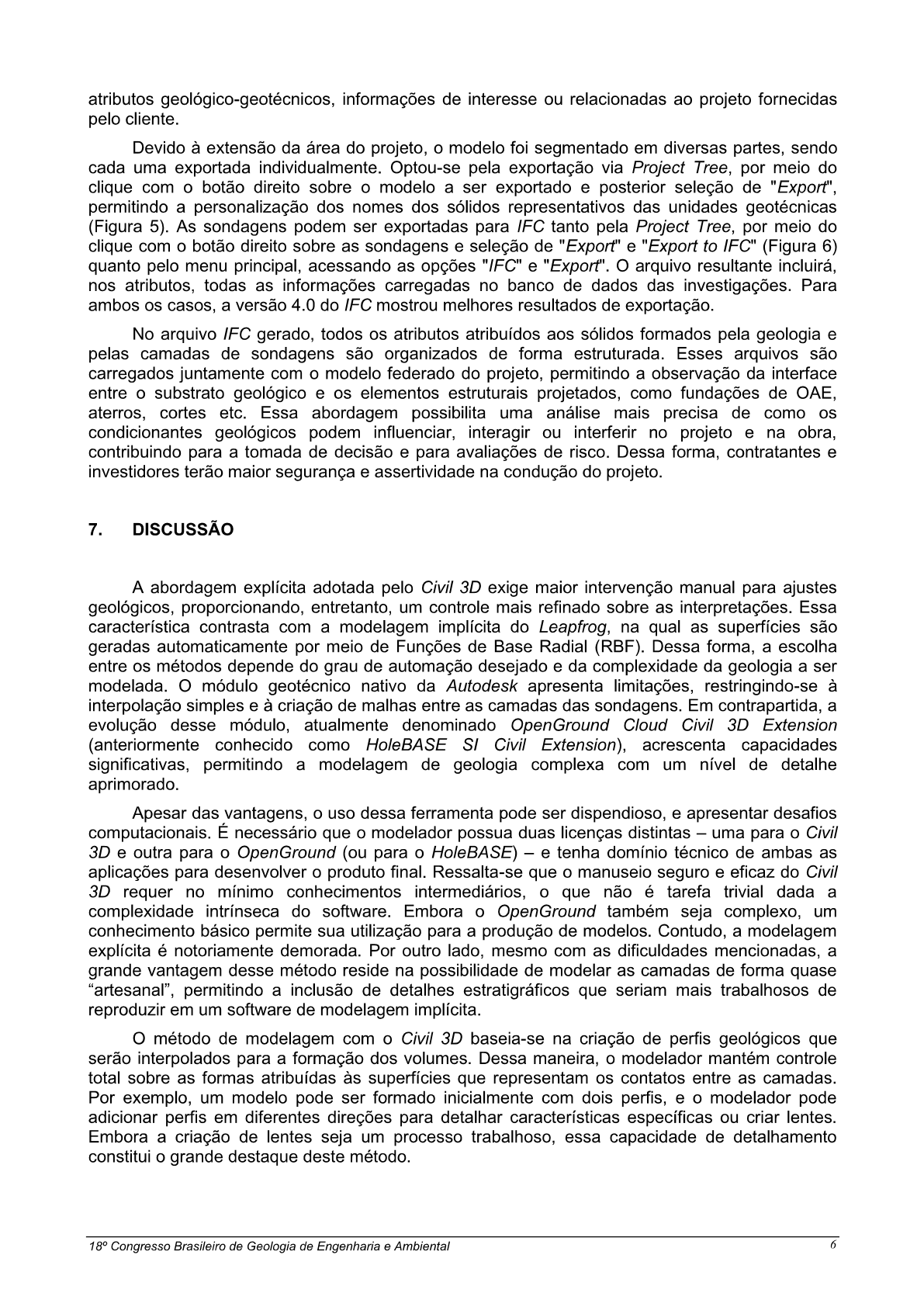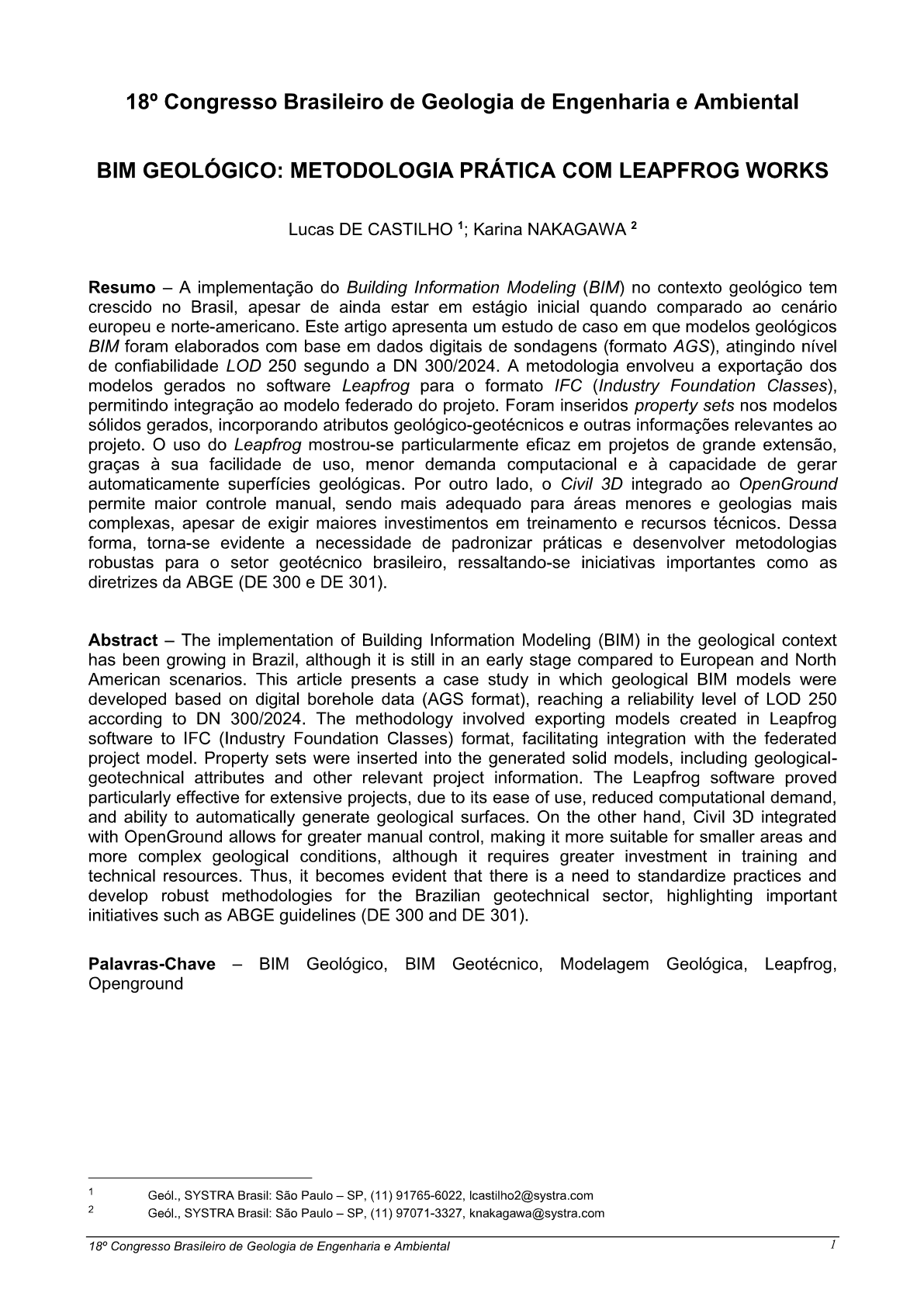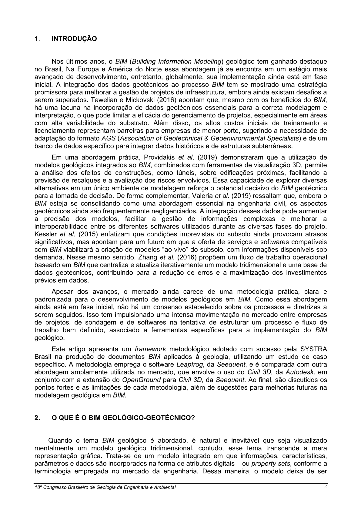 A implementação do Building Information Modeling (BIM) no contexto geológico tem crescido no Brasil, apesar de ainda estar em estágio inicial quando comparado ao cenário europeu e norte-americano. Este artigo apresenta um estudo de caso em que modelos geológicos BIM foram elaborados com base em dados digitais de sondagens (formato AGS), atingindo nível de confiabilidade LOD 250 segundo a DN 300/2024. A metodologia envolveu a exportação dos modelos gerados no software Leapfrog para o formato IFC (Industry Foundation Classes), permitindo integração ao modelo federado do projeto. Foram inseridos property sets nos modelos sólidos gerados, incorporando atributos geológico-geotécnicos e outras informações relevantes ao projeto. O uso do Leapfrog mostrou-se particularmente eficaz em projetos de grande extensão, graças à sua facilidade de uso, menor demanda computacional e à capacidade de gerar automaticamente superfícies geológicas. Por outro lado, o Civil 3D integrado ao OpenGround permite maior controle manual, sendo mais adequado para áreas menores e geologias mais complexas, apesar de exigir maiores investimentos em treinamento e recursos técnicos. Dessa forma, torna-se evidente a necessidade de padronizar práticas e desenvolver metodologias robustas para o setor geotécnico brasileiro, ressaltando-se iniciativas importantes como as diretrizes da ABGE (DE 300 e DE 301).