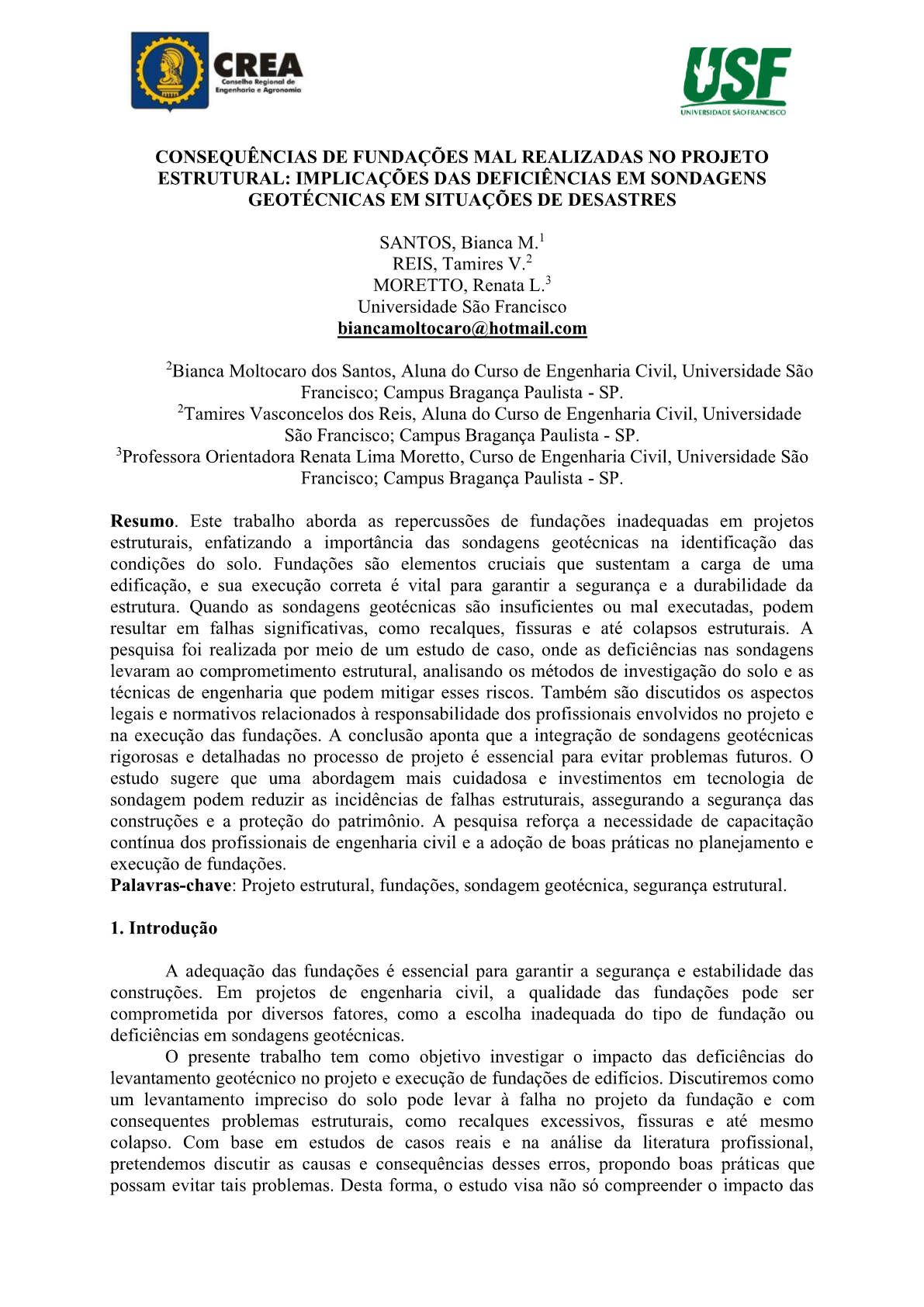 (1) Bianca Moltocaro dos Santos, Aluna do Curso de Engenharia Civil, Universidade São Francisco; Campus Bragança Paulista – SP.