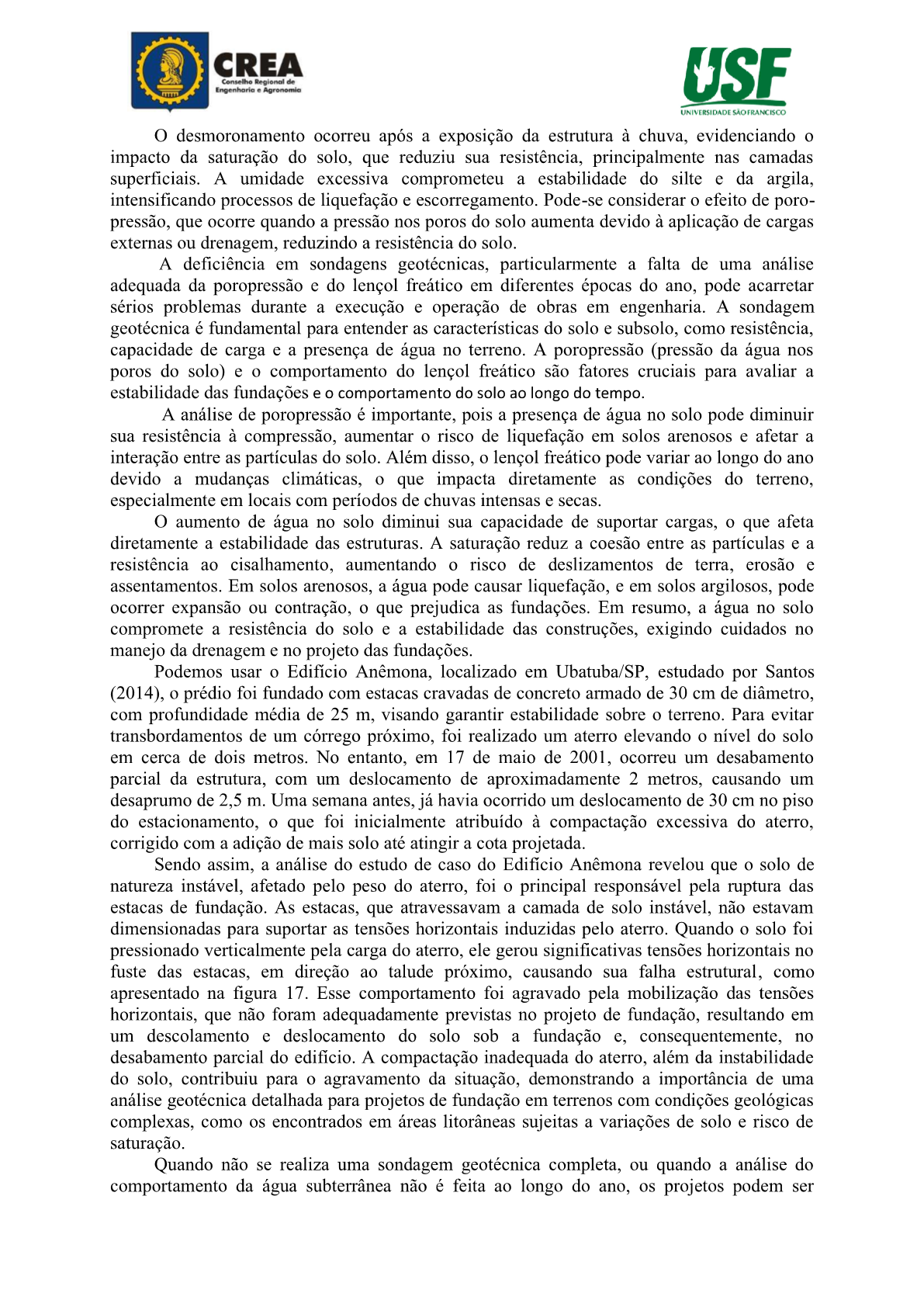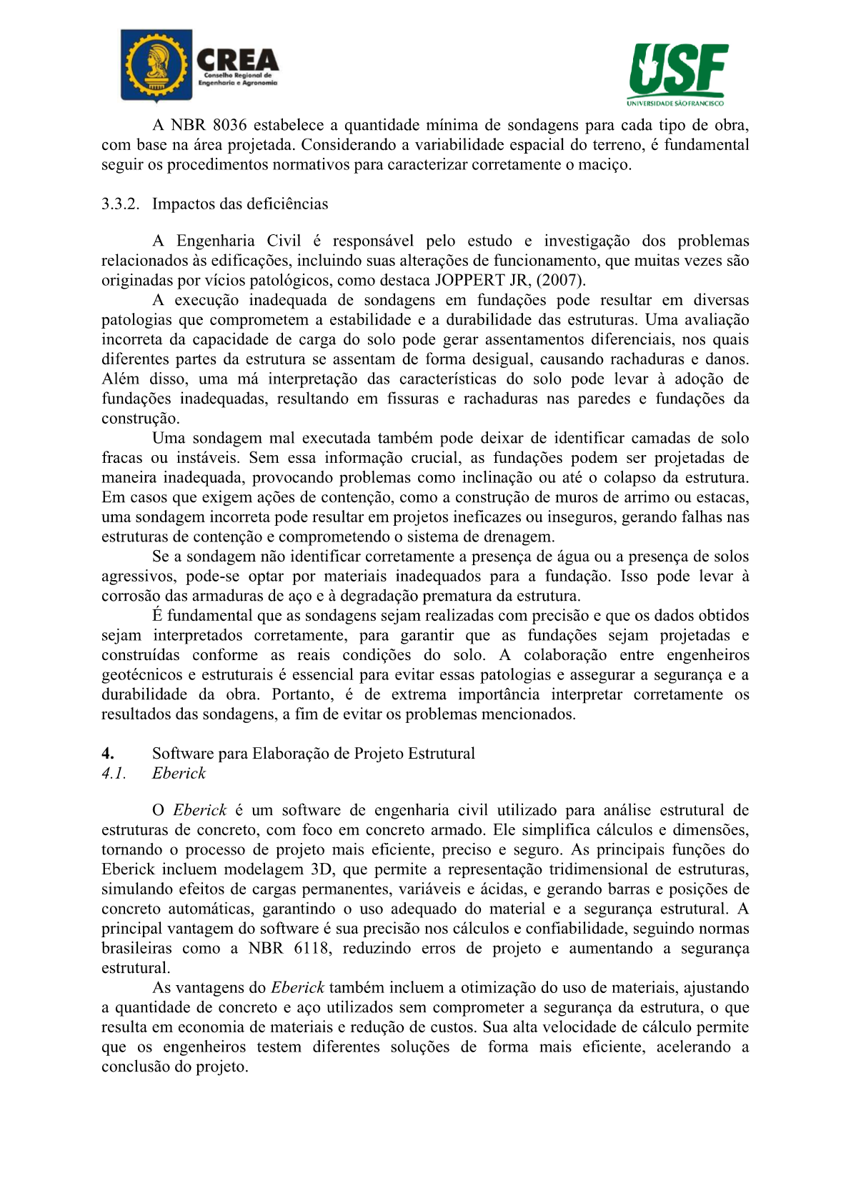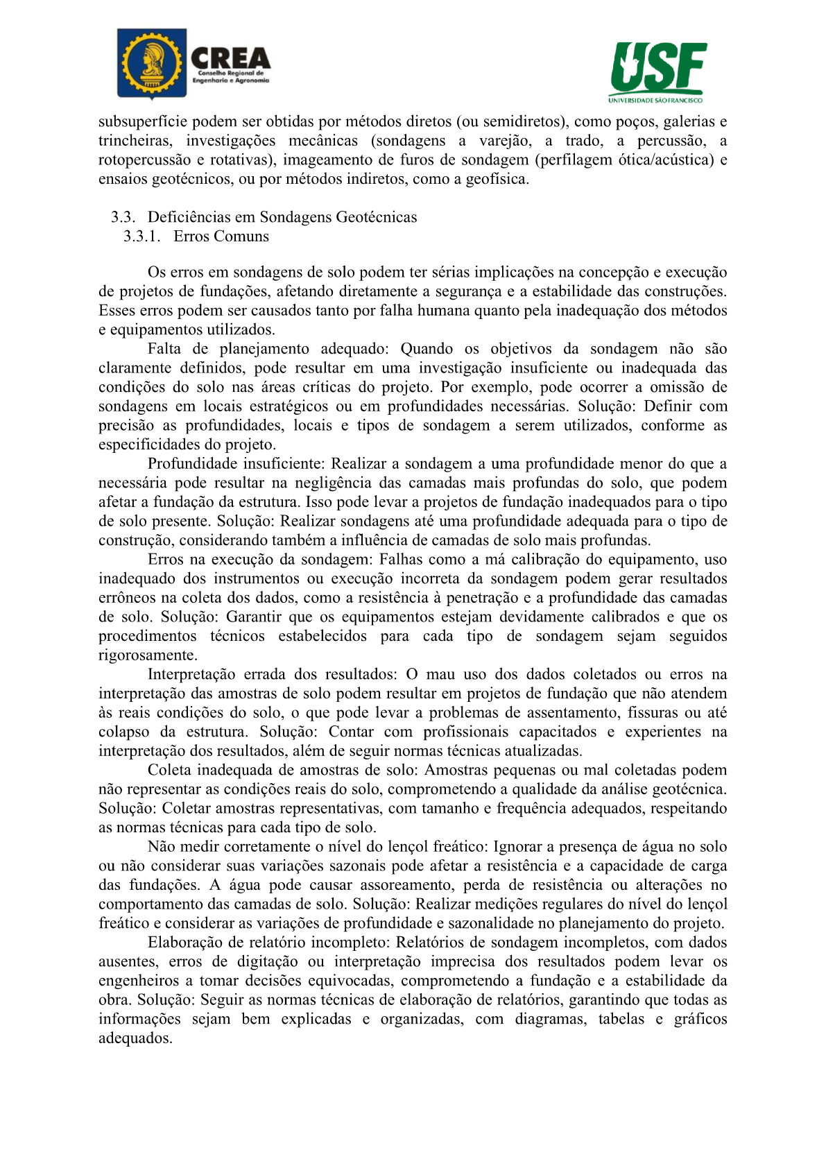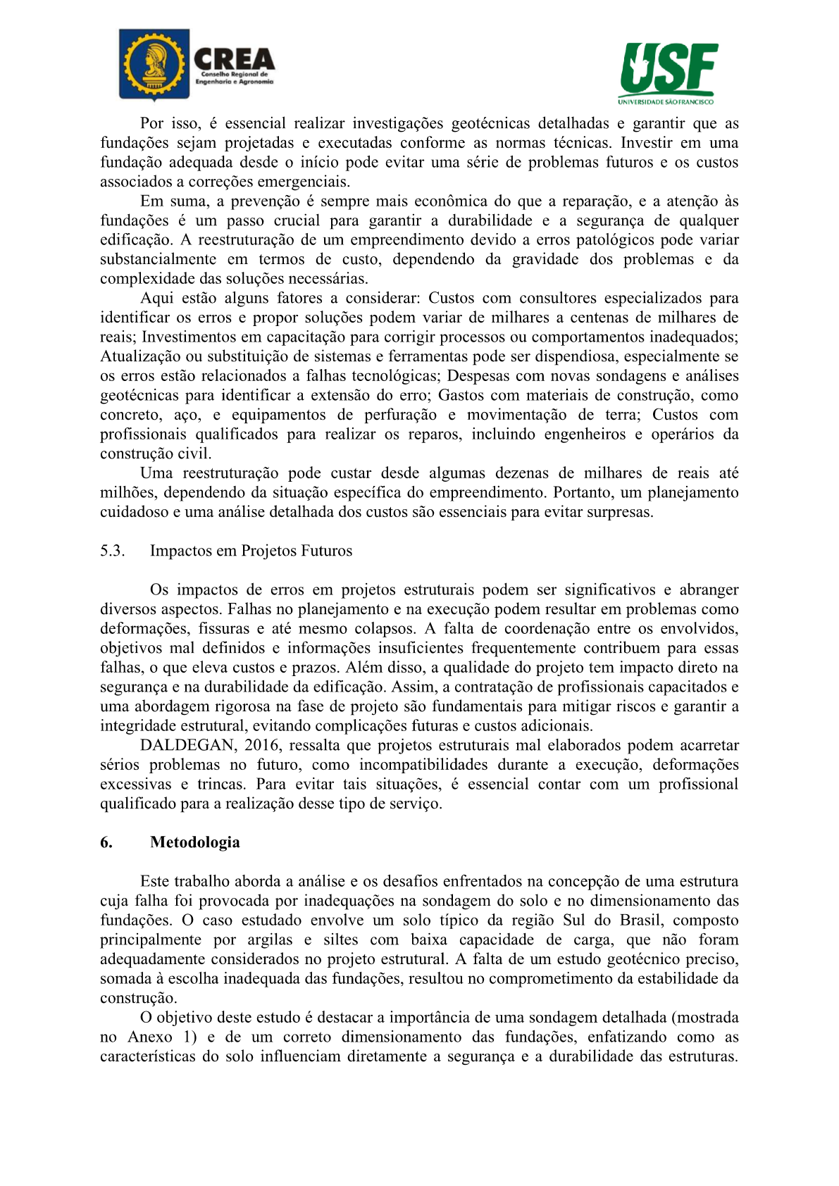 Este trabalho aborda as repercussões de fundações inadequadas em projetos estruturais, enfatizando a importância das sondagens geotécnicas na identificação das condições do solo. Fundações são elementos cruciais que sustentam a carga de uma edificação, e sua execução correta é vital para garantir a segurança e a durabilidade da estrutura. Quando as sondagens geotécnicas são insuficientes ou mal executadas, podem resultar em falhas significativas, como recalques, fissuras e até colapsos estruturais. A pesquisa foi realizada por meio de um estudo de caso, onde as deficiências nas sondagens levaram ao comprometimento estrutural, analisando os métodos de investigação do solo e as técnicas de engenharia que podem mitigar esses riscos. Também são discutidos os aspectos legais e normativos relacionados à responsabilidade dos profissionais envolvidos no projeto e na execução das fundações. A conclusão aponta que a integração de sondagens geotécnicas rigorosas e detalhadas no processo de projeto é essencial para evitar problemas futuros. O estudo sugere que uma abordagem mais cuidadosa e investimentos em tecnologia de sondagem podem reduzir as incidências de falhas estruturais, assegurando a segurança das construções e a proteção do patrimônio. A pesquisa reforça a necessidade de capacitação contínua dos profissionais de engenharia civil e a adoção de boas práticas no planejamento e execução de fundações.